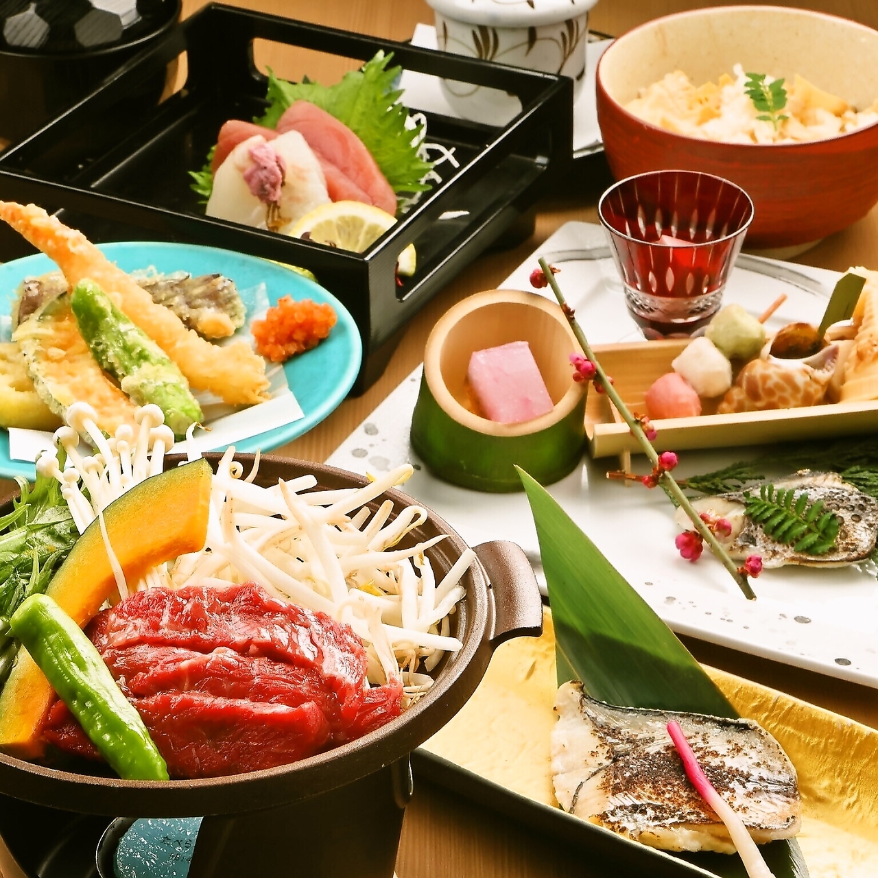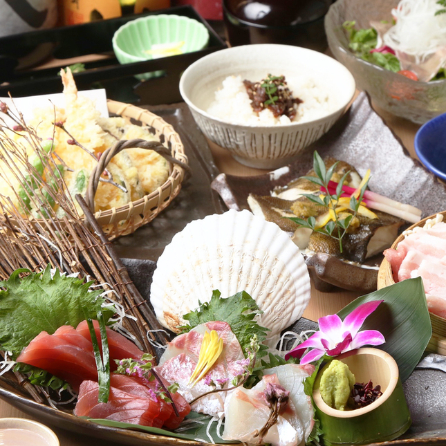 <1名様分ずつのセパレート個別盛りでご提供いたします> 【前菜】前菜五種盛り合わせ(よもぎ麩・鶏八幡巻・大根の含め煮・東錦貝旨煮・穴子煮凝り)) 【造里】造里二種盛り ~生本鮪赤身・愛媛県産真鯛~ ※内容は日によって変わります。 【揚物】海老とのどぐろ 季節野菜 天麩羅盛合せ 【焼物】鰆の西京焼き 【蒸物】ポルチーニと長芋の茶碗蒸し 紫円餡 【焼物】三元豚朴葉焼き 季節野菜 or 国産豚しゃぶしゃぶ 季節野菜 ※ご予約時にどちらか1つをお選び下さい。 記載がない場合、「三元豚朴葉焼き」でご提供致します。 【御飯】秋鮭と山菜の炊き込みご飯 【椀物】蜆の味噌汁 【香の物】漬物二種 ※お食事のみのコースとなります。 ※+1500円で飲み放題をお付けする事も可能です。 |